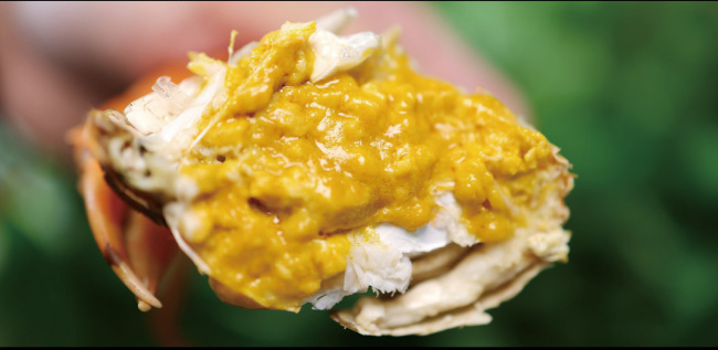 每逢炎夏,青母蟹會在產(chǎn)卵時棲身于淺灘河畔,在陽光的照射下,體內(nèi)的蟹膏分解成金黃色的油脂,然后滲透到體內(nèi)的各個部分,使得整只蟹晶瑩剔透、充滿黃油,因此被稱為黃油蟹。
